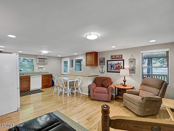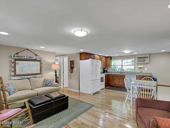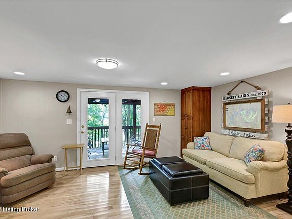 You will love this absolutely darling lakefront cottage with a dock at Nolin Lake in gated Oakland Hills! The main level is an open floor plan with family room, kitchen and eating area all open. The first floor family room has access to the covered rear deck. There are two bedrooms and a full bath on the main level. The lower level has a family room that walks out to the patio with porch swing. There's almost 1000 sq ft of outdoor living with screened in deck, covered deck plus patio area to enjoy Mother Nature's magic! Enjoy the views and cool breezes here. Just grab a favorite beverage and chill outdoors when those pop of showers hit. There's some unfinished storage in the lower level, as well as an outdoor shed for storage. Get the marshmallows ready as there's a fire pit just waiting for you to enjoy starlit skies and quality time with those you love. The path to the lake is just behind the house to access the boat dock. Moutardier boat ramp is just a short distance outside of the neighborhood about 2 miles from the home. Seller willing to sell turn key including golf cart, minus some sentimental and personal items. Dock is second from left while looking from shoreline. Schedule a visit soon! Note-one bedroom does not have a closet, which is pretty typical for this area. Age of home is a best guess. PVA shows built in 1960, but dam not completed until 1963 and subdivision restrictions recorded in 1967. Several Sellers need to sign documents, so 48 hour response on offers is requested.