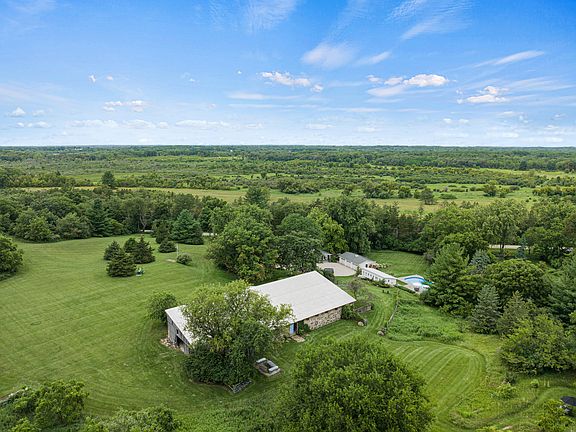 This Iconic Bull Valley Farmhouse is situated on 8 beautiful rolling acres. Enjoy an evening toast to the sunset on "Cocktail Hill" overlooking the well maintained grounds and the 700 acres of conservation land across the street. Ultimate privacy in this home featuring updated large eat-in magazine worthy country kitchen with beamed ceilings, high end stainless steel appliances (Viking-Bosch), plenty of cabinets and counter space. Brand new updated full bath, stunning! Whole house Kohler Generator. The unique 10 stall barn was originally built as a dairy barn from the stones and boulders on the property. It has since has been elevated to a wedding venue and many gatherings with friends and family for campfires and music concerts. Firewood transfers with the property but musical talent does not! Relax on the swing in the screen porch while watching the chickens in the chicken coop, formally the little school house. Full on natural outdoor shower next to the built in salt water swimming pool with new liner 2022, heater 2021. Gleaming woodwork, beams and floors throughout. All mechanicals within the past few years. Down the street is access to horse trails.