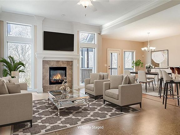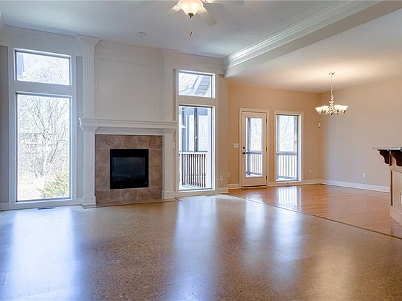 This home is ideally located affording you the luxury of community in the front and privacy in the back. It sits in the heart of this lovely community, across from the tranquil community pool and backs to a beautiful treed green space.  The open concept creates the perfect environment for family gatherings with additional space on the screened deck off the dining room.  The walkout basement has been finished with an additional family room and full bath,  ideal to watch Chiefs games with the celebration overflowing onto the lower, partially covered patio.  This home can provide a haven for family for years to come.