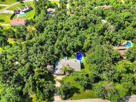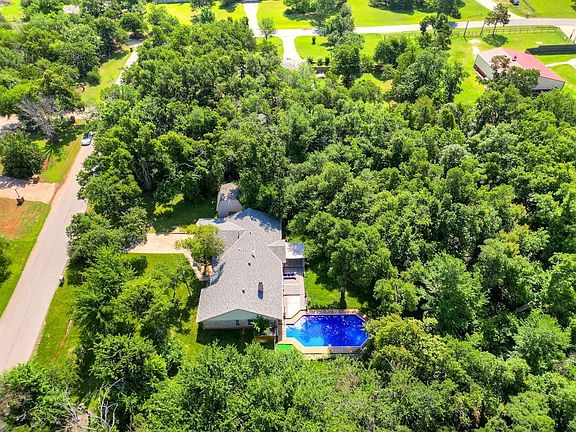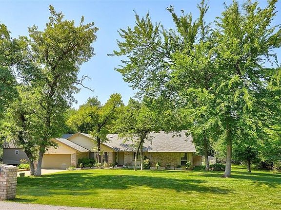 Fabulous 1+ wooded acre property with Edmond schools, Logan county taxes, and a quiet neighborhood with no HOA! Large windows throughout this one level home provide beautiful views of the gorgeous outdoor spaces, including the amazing back yard with sparkling in ground pool and extensive deck! The spacious living area boasts a vaulted cathedral ceiling and built-ins surrounding the wood-burning fireplace which flows seamlessly into the dining area and kitchen, all with easy to maintain wood-look tile flooring. The beautiful kitchen features double ovens, gas cooktop, huge pantry, and ample granite countertops with a breakfast bar creating a space perfect for cooking and gathering. The fabulous split floor plan includes a large main bedroom with walk-in closet and en-suite bath with separate tub and shower. The guest bedroom wing includes one bedroom with a private en-suite bath that also functions as a pool bath with access to the exterior, as well as two additional bedrooms that share a large hall bath with a double vanity. Located at the front of the home, the separate study makes a wonderful office space, or even an extra living space, game room, or craft area. The mudroom/laundry area leads to the 2 car garage which includes an above ground storm shelter and an exterior door leading to a small outbuilding providing additional storage or a workshop. The backyard set up is perfect for entertaining with views of the lush landscape complete with full yard sprinkler system, and beautiful pool from the large composite deck. Come see this home and make it yours today!