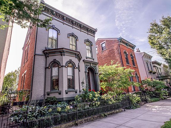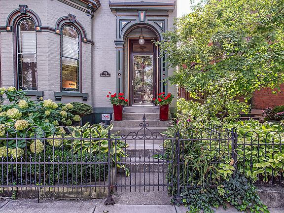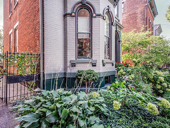 Absolutely stunning, this impeccably renovated three-story brick Italianate is among the most distinguished homes in the East Row Historic District! Situated on a quiet, tree-lined block, the residence showcases original woodwork, restored hardwood floors, a grand staircase, and six original mantles. The newly renovated chef's kitchen features Café appliances, custom cabinetry, and an oversized island—perfect for cooking and entertaining. The second floor offers three spacious bedrooms and two full baths, including oversized primary with walk-in-closet. The finished third floor provides a third full bath, wet bar, and a large recreational room ideal for entertaining or relaxing. Lush landscaping surrounds the home with a fountain and multiple seating areas, creating beautiful outdoor spaces for gatherings or quiet evenings. A rare three-car garage and generous basement storage complete this exceptional property, blending historic charm with modern luxury in one of the area's most sought-after neighborhoods.