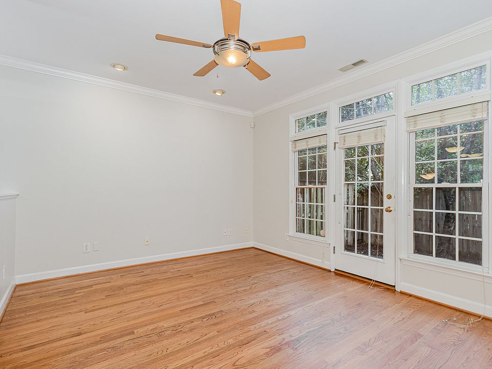 Ceiling fansHardwood floorsGranite countertopsTile backsplashWhite cabinetry