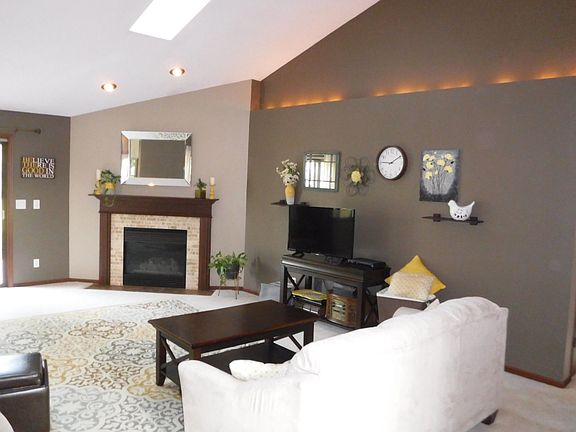 Immaculate open concept 3 bedroom 2.5 bath ranch home with 3 car garage located in River Bluff Estates. Spacious kitchen with bright eating area, formal dining space and doors leading to private covered porch. Living room offers cathedral ceilings, gas fireplace, skylights and sliding doors leading to stamped patio in your fully fenced backyard with additional storage garage and children's play area. Master suite with full bath and large walk in closet. Lower level offers huge rec room with full bar and lots of room for fun and entertaining! Main floor laundry. Schedule your private showing today!