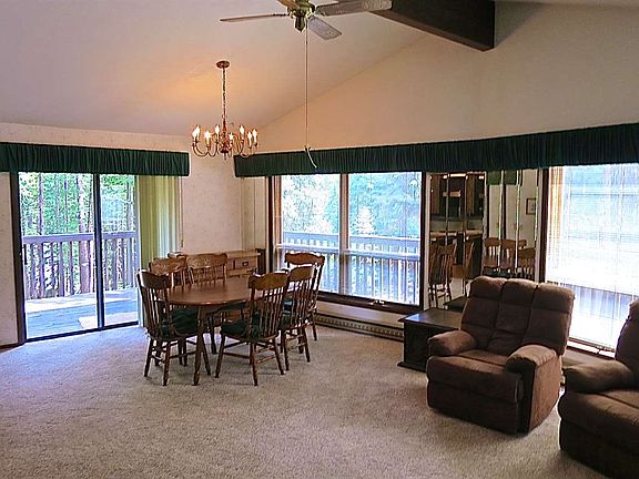 If you have a large group, then look no further! This spacious home boasts upper and lower level complete homes with: two kitchens, two living rooms, dual utility rooms, and even two different decks for taking in the majestic mountain views! The upper level has just had brand new carpet installed, and the vaulted living room ceilings create a ton of natural light through the wall of windows. Each level has a tasteful rock hearth with efficient pellet stoves. Lots of parking, a nice two car garage, wrap around decking, and tall pine and fir trees offer a shady retreat in the summer afternoons. Bring your horseshoes for the backyard! Price below a previous appraisal and ready for two families if you like!