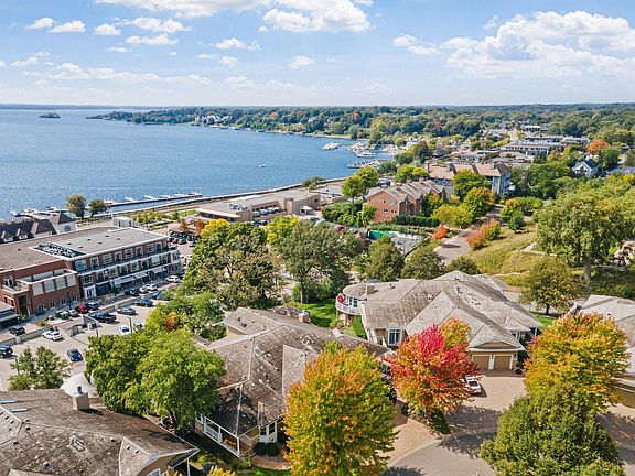 Wake up on the hill above downtown Wayzata with Lake Minnetonka framed right outside your windows. This is the sweet spot of Widsten Circle. Steps to coffee, restaurants, and the lake. Back home you get a warm, cedar-shake exterior, a covered front porch, and a floor plan that lives easy on two levels with big views and real privacy. Inside, light pours through bay windows across Saddle Black Walnut floors. The kitchen brings maple cabinetry fitted with roll-outs, workstation, full-height pantry, and a center island. The dining room connects cleanly to the living room where a gas fireplace with cultured stone and a reclaimed wood mantel anchors the space. Built-ins in rustic alder handle your media and display. A rounded bay takes in panoramic lake views and a full-glass door walks out to the screened porch and the wraparound balcony in the treetops. The primary suite sits quietly on the main level with vaulted ceilings, patio door to the porch, and a walk-in closet with custom organizers. The primary bath has room to exhale with a jetted tub on a tile deck, an oversized glass shower with bench, dual sinks, makeup counter, and linen storage. Main-level office with French doors and a bay window for focus. Main-level laundry with cabinets and sink. A proper half bath for guests. Downstairs, the lake views keep going. The family room is wide open for movie nights and game days with patio access to the lower terrace and shared green space. Bedroom two has water views and a walk-in. Bedroom three has French doors and a walk-in. There is a full bath, a flex room with a second kitchen for long-term guests or hobby time, and great storage. Outside, the lifestyle is ready to go. Maintenance-free wraparound balcony up top. Covered patio below. Beautiful mature trees, boulder walls, and a shared patio scene with a stone-wrapped wood-burning fireplace, pergolas, and garden beds. Finished and heated two-car garage with floor drain. Paver driveway. Cedar shake with brick accents for timeless curb appeal. This is the Wayzata walk-to-everything address that still feels like a retreat.