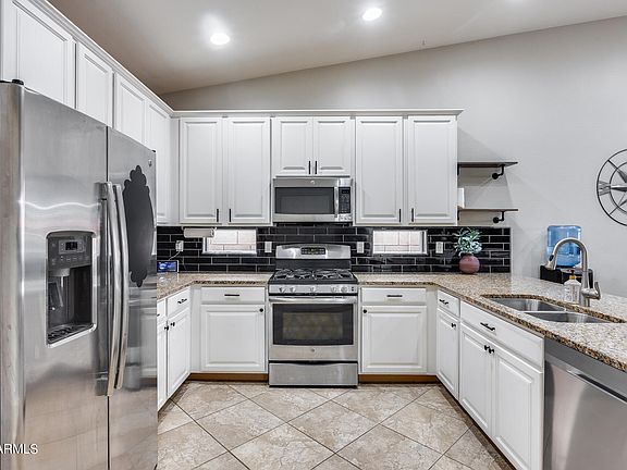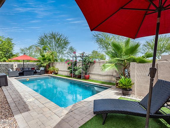 Fantastic location in Morrison Ranch!! Recently updated single-level Lennar home featuring 5 bedrooms, 3 baths, and a spacious great room. The upgraded kitchen features stainless steel appliances, granite countertops, a new backsplash, and a striking stone accent wall. Enjoy luxurious details such as tile countertops in the bathrooms and ceramic tile tub/shower surrounds. This airy and warm home boasts vaulted ceilings and expansive living spaces. The backyard is an oasis with pavers, artificial turf, a Pebble Tec pool featuring custom lights and water features, and an extended driveway with a sprinkler system in the front. Located near parks, a greenbelt, shopping, schools, and freeways, this home offers the best of Gilbert amenities with the benefit of Mesa taxes.