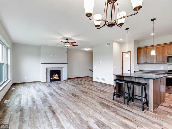 Model Closeout Discount. Totally finished and ready for a quick closing. Home is adjacent to an open space with views of Kirredge Crossings Neighborhood Park from the living room, dining room, and kitchen. Beautiful and unique quartersawn wood cabinetry throughout the home. The main level features carefree plank flooring 9ft ceilings and a gas burning fireplace. Upstairs features a good size master bedroom with a walk through bath and a convenient laundry room nearby. Lower level has a family room with a bath and a guest bedroom. Landscaped, sodded, and sprinkled yard. A unique neighborhood that is surrounded by nature with open views of wildlife and protected wetlands