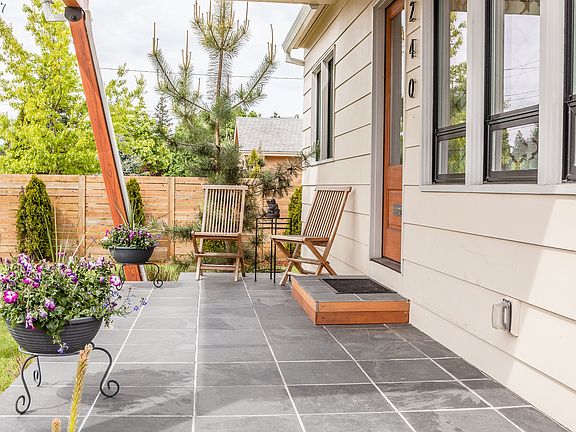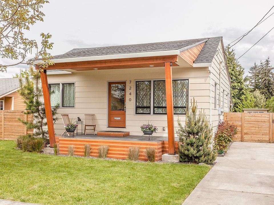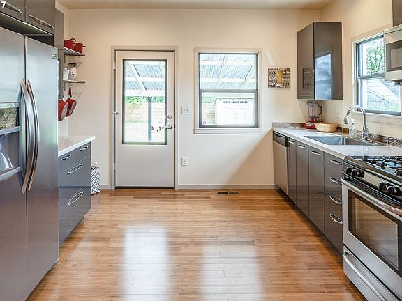 Sweet Bungalow on oversized lot (possible ADU?) 2014 complete remodel with new electrical, plumbing, roof, siding, gas furnace, and windows. SS app, bamboo flr. Separate entrance to finished basement with BR and bath. Roof has Solar Panel System maintained for free by Solar City. Hybrid WTR heater combined with added insulation help with low utility bills. Solid core doors keep the home quiet.