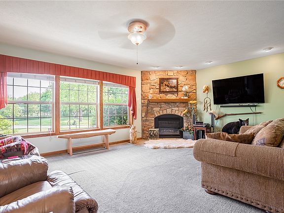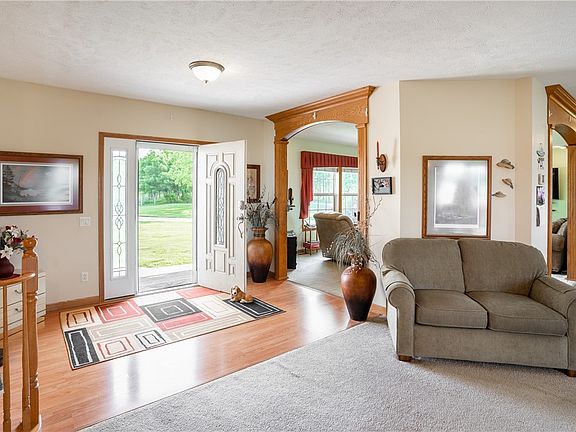 Welcome to this secluded & serene acreage! One owner, custom walkout ranch sits on over 9 acres overlooking Yellow Banks Park to the south & tree lined privacy to the east: Picturesque! Secured entrance opens to the ¼ mile concrete driveway passing the 5 acre pasture w/animal fencing. 9 animals allowed. Over 3,000 finished sqft offers an open floor plan. Formal dining is open to the kitchen w/gorgeous hickory cabinets paired w/granite countertops & pantry. Large island holds a small prep sink matching the granite kitchen sink. All appliances included! Arches lead to the great room w/center attention to the gas fireplace! Central to the 3 bedrooms is the office area for easy access. Retreat to the master suite w/sliders to the deck w/hot tub, walk in closet & spa like master bathroom. Another full bath is near the other bedrooms. 1st floor mudroom w/washer & dryer, utility sink & large closet space is near the extra large 3 car, heated garage w/plenty of parking space. Finished lower level w/heated flooring is set up for a guest with 1/2 bath, kitchen area & bedroom w/private bath. Check out the workout room & large rec room. Geothermal energy provides efficient heating/cooling. 42x80 insulated outbuilding is a jaw dropper! Elevated “man cave” has AC. Plenty of storage with 12x12 & 9x12 overhead doors, 200amp service, water, 3 floor drains. There are two fire pits, one under a pergola, playset, pond-less water feature w/waterfall & the hot tub. Come Home to Runnells, Iowa!