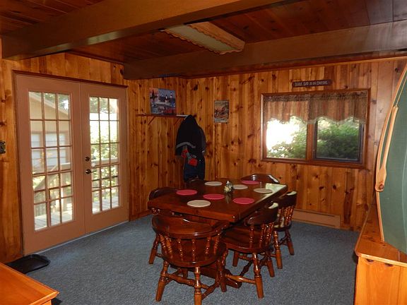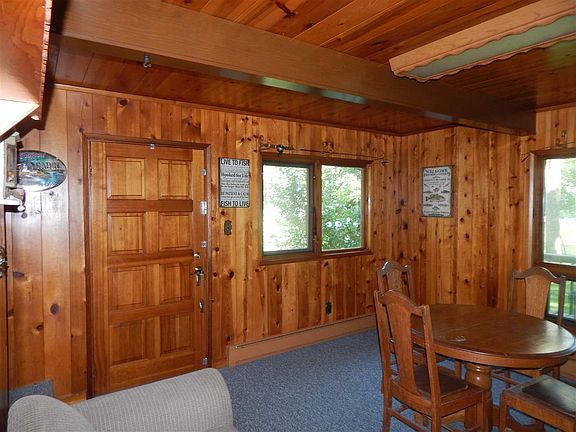 Custom 3 bedroom 2 bath built Lindal Cedar home with vaulted cathedral ceiling, with a concrete walkway out to the 103 ft of water frontage. Knotty pine interior and a spacious living room overlooking the lake. Warm fireplace, built in cabinets, and hutch, and three newly large built decks on the main level of the home along with a walk out balcony from the master bedroom. 2+ oversized heated garage with an attached single car workshop and a store shed