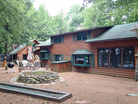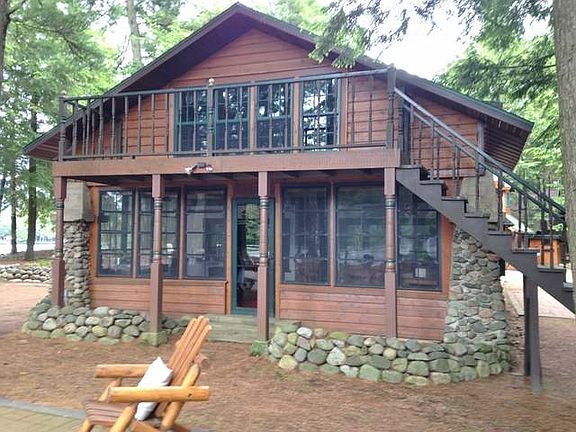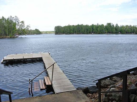 Located on a rounded point of land, on the chain of 28 lakes, with water views in 3 directions. This setting can be appreciated from most rooms in the home as well as from the lakeside gazebo, bonus room above the garage, around the firepit, or from the pier! The home blends with the wooded surroundings with a beautiful wood and stone exterior and many attractive wood framed features inside as well. There is an enclosed front porch, stone fireplace in the living area, and even a small office!