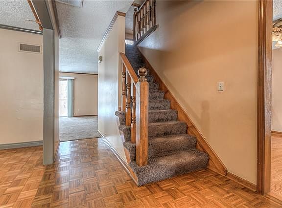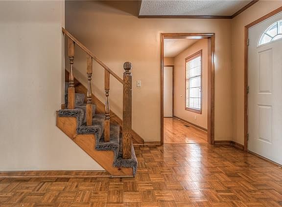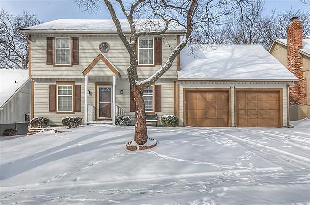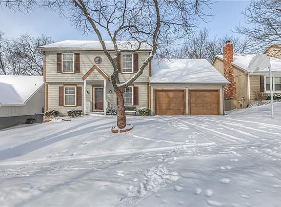Spacious traditional 2 story home in Woodhaven neighborhood. The kitchen has hardwood floors, a breakfast area, and room for bar stool seating at the counter. Parquet wood flooring in the entry and formal dining room. Solid wood doors throughout. Living room with painted brick fireplace and slider to the back deck. Half bath a laundry room off the kitchen. The main bedroom has a vaulted ceiling with a fan, a bay window with a view of the backyard, and a large walk-in closet. 2nd and 3 bedrooms are large, the front room has a big walk-in closet. The finished basement includes an extra room or 4th non-conforming bedroom, a big rec room, and a full bath - all just finished in 2019. What you can't see under the snow is $2200 in landscaping that was just added, sprinkler system, and a new deck added in 2020. The backyard is large with a wood fence and backs to neighborhood trees and greenspace. Walk to blackfish parkway walking trails. Easy access to Shawnee Mission parkway and 435.
