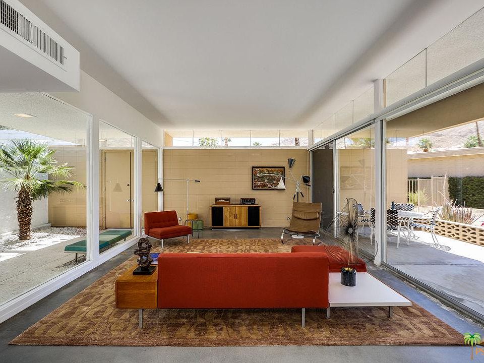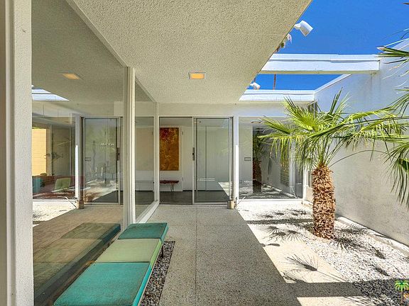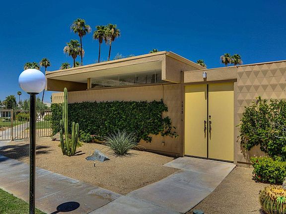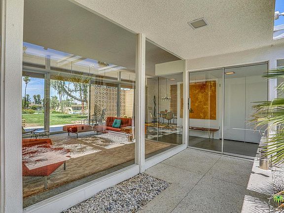 Pristine updated William Krisel design in one of the best locations in Sandpiper! Located in a private, quiet location far from the noise of El Paseo, the main patio overlooks the community pool and green space, with beautiful west-facing mountain views. The living and dining rooms feature tall ceilings, concrete block walls and clerestory windows that provide a bright, modern living space. The glass atrium entry, a unique mid-century design element, provides architectural interest and brings the outdoors in. This 2 bedroom, 2 bath condo has been meticulously updated to enhance the original design of the home. Gray concrete floors throughout provide a neutral palate for your furnishings. Original kitchen cabinets have been refinished and stained to bring warmth into the home. Bathrooms feature updated shower doors and tiles and updated fixtures.
