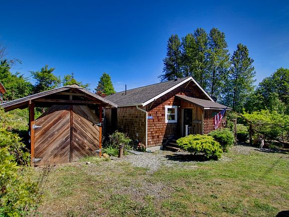 Cape Cod-Style Cabin on a Sunny Double Lot. What a nice little slice of paradise this home is. Very well built 912 SF 2 bedroom, 1 bath plan with a completely open design, huge island with eating bar, loads of cabinet space, vaulted tongue and groove ceiling, wood stove, cool bathroom, & 2 very roomy bedrooms, one with a walk-in closet. Exterior is all cedar shingles and everything is built to last. Amazing greenhouse, gazebo, log shed and more. Enjoy the little creek that flows by, the lily pond and lots of garden space and plantings. Turn-key with all appliances included.
