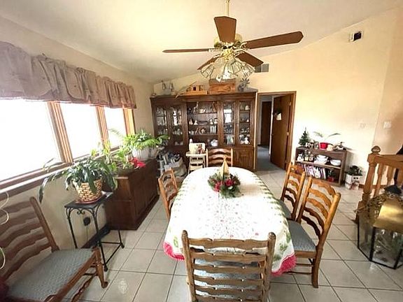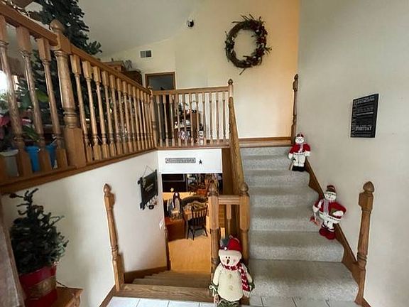 Entrance: Split foyer with arched window over double doors. Dining Room: Tile floor, vaulted ceiling, painted walls, south & east casement windows for natural light. Kitchen: Schmidt custom cabinets, many specialty cabinets, roll out shelves, Corrain counter top on island with drop down area for lunch. Ceramic tile floor. Living Room: Open to kitchen. Berber carpet. Huge shelved storage flanks on wall. Bedroom: Painted walls, casement windows, carpet. Bedroom: Vaulted ceiling, casement windows, carpet, painted walls. Bath: Double sink, shower/tub combo, tile floor. Master Bedroom: Vaulted ceiling, painted walls, 2 closets, private bath with corner tub, separate shower, double vanity, sky light, vaulted ceiling, brick accent wall. Laundry: Convenient to kitchen and spacious. Garage: 2 car finished & insulated on same level as kitchen. Lower Level Walkout Basement: L shaped family room has berber carpet, brick fireplace with separate wood storage. South & east sunlight plus French patio doors. Office or Exercise Room: Spacious with ceramic tile floor, French patio doors. Bedroom or Craft Room: Berber carpet, painted walls, casement windows, closet. Bedroom: Carpet, painted walls, closet, casement window Bedroom: Carpet, painted walls, closet, casement window. Bath: Shower and vanity, commode, ceramic tile floor, 2 water heaters in utility closet for family use. Utility closet: High efficiency electric water boiler. Heat pump for heat and CAC. 10 acres surveyed legal description includes tree studded yard, also woodsy timber and small pond in south west corner of lot. Easement for drive to US 67