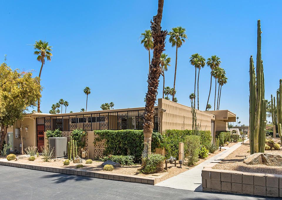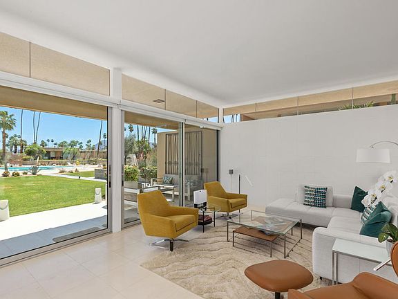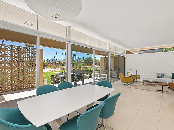 Discover the epitome of mid-century modern elegance with this stunning 2-bedroom, 2-bathroom condo nestled in the coveted Sandpiper community in Palm Desert. Designed by the legendary William Krisel, this home spans 1,531 square feet of impeccably styled living space that perfectly captures the essence of the era. Step through the dramatic front entry atrium, a signature feature that enhances the home's architectural appeal and bathes the interior in natural light. The living spaces boast classic mid-century details, including sleek block walls, high ceilings, and expansive clerestory windows, offering a sophisticated and inviting ambiance. Recent upgrades include energy-efficient dual-pane sliders and windows, a fully remodeled kitchen with new cabinets and state-of-the-art appliances, and tastefully redesigned bathrooms featuring contemporary cabinets, sinks, and faucets. The electrical panel has been upgraded, and the high-efficiency A/C system is newer, ensuring comfort and convenience. Whether you're enjoying the peaceful community or exploring the vibrant local culture, this is a perfect sanctuary for those who appreciate style, comfort, and a touch of historical significance. Welcome to your dream home in Sandpiper Palm Desert, where every detail is designed to inspire. This home holds a historic designation with the City of Palm Desert, complete with an existing Mills Act contract that reduces property taxes and is transferrable to the new owner.