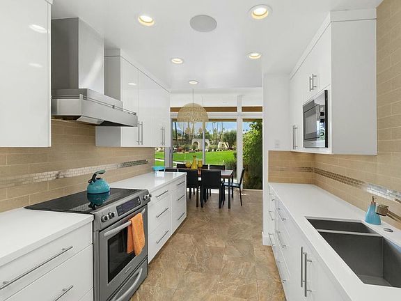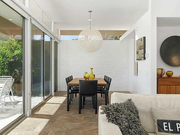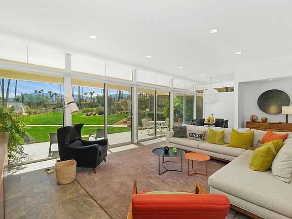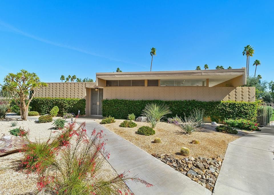 This William Krisel-designed mid-century modern home in Sandpiper blends iconic architecture with thoughtful updates. Recognized with a historical designation by the City of Palm Desert, this 3-bedroom, 3-bathroom home showcases high ceilings, clerestory windows, and signature breeze block walls that define its timeless design. Modern upgrades, including tile flooring throughout, recessed lighting, and aluminum Fleetwood dual-pane sliders, enhance its style and function. The updated kitchen features sleek cabinetry, quartz countertops, stainless steel appliances, and a beverage refrigerator. Each bedroom has an ensuite bathroom, and upgraded closet doors add to the home's clean, contemporary aesthetic. The living room includes a built-in cabinet with a disappearing lift-mounted TV, maximizing space and design. Step outside to enjoy stunning mountain and pool views from the north-facing patio or relax in the private enclosed courtyard with a gas firepit. Sold furnished with designer furnishings this home is move-in ready. A one-car garage sits conveniently adjacent to the front door. Featured in a Sandpiper Modernism Week tour, this architectural gem is ideally located in South Palm Desert, just minutes from El Paseo's top shopping and dining.