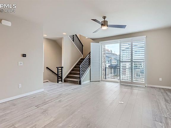 Great convenient location near Cottonwood Creek Park and Trail. Stunning Modern 3-story home. Academy D20 schools. Higher-quality, carpet throughout upper level, stairs and bedrooms. Central air. Bright, open concept w/spacious living areas and gorgeous plantation shutters window covering. Modern front door w/rain glass inserts. The entry has high ceilings & stairs that take you to the main & lower levels of this stunning home. The lower level has a tile landing, a garden-level bedroom, & access to the finished & heated 2-car garage w/service door to the side yard. There is a main level powder bathroom w/vanity & quartz countertop. The great room boasts slider to the composite deck outdoor entertaining with gas line hookup for grill. The dining area off the kitchen has view windows for extra light, a modern light fixture, & designer paint tone. The gourmet island kitchen offers a walk-in pantry, counter bar, wall mounted oven & microwave, gas cooktop & soft close cabinets w/quartz countertops, and tile backsplash. Stainless steel appliances include a 5-burner gas cooktop, dishwasher, & built-in microwave oven. Designer iron stair rails take you to the upper level. There are 2 bedrooms, 2 baths, & laundry closet upper level. The primary bedroom has a lighted ceiling fan & attached elegant shower bath. The bathroom features tile floors, a dual sink vanity w/quartz countertop, a floor to ceiling tiled shower w/built-in seat, a linen closet & generous walk-in closet. There is an upper-level hall bath that has tile floors, a vanity w/quartz countertop, & tiled tub/shower. Secondary upper bedroom also offers a lighted ceiling fan & walk-in closet. Low maintenance, xeriscape yard features a concrete front walkway, auto sprinklers, rock gardens, & drought-resistant shrubs. Close to schools, hospital, shopping & entertainment. Minutes to Cottonwood Creek Park, Disc Golf, Pool, Recreation Center & Trails.