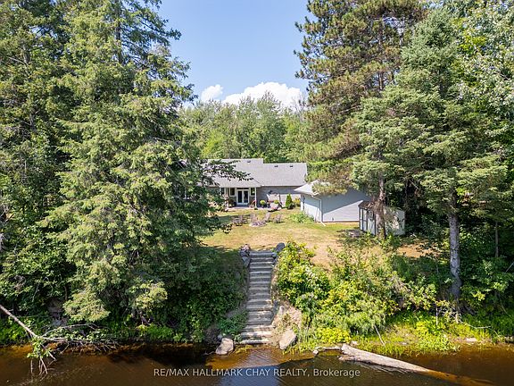 Located on the serene Black River in Ramara Township, this beautiful brick bungalow, built in 2018, offers the perfect blend of comfort, style, and waterfront living. Step into the spacious, screened-in front porch a welcoming space to enjoy the peaceful surroundings. Inside, the open-concept layout features vaulted ceilings and a bright, airy living space that includes a large living room with a double-sided gas fireplace, a dining area, and a modern kitchen with quartz countertops, stainless steel appliances, and an induction stove.The kitchen and dining room feature expansive windows and a French door walkout to a covered patio with scenic river views ideal for entertaining or relaxing outdoors.The waterside primary suite includes a walk-in closet and a 4-piece ensuite. Two additional bedrooms offer comfortable accommodations, with one enjoying the warmth of the shared double-sided fireplace. Heated large-format ceramic tile flooring runs throughout, providing cozy year-round comfort. A 3-piece main bathroom features a spacious walk-in shower. Unwind in the private outdoor hot tub after a day on the river. This property also includes a two-car attached garage with inside entry, plus a newer, oversized detached garage perfect for a workshop, storing another vehicle, or housing all your recreational toys. Enjoy direct river access for canoeing, kayaking, paddle boating, or boating from your own backyard. All this just minutes from Casino Rama, Washago, and Orillia.