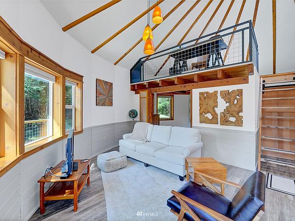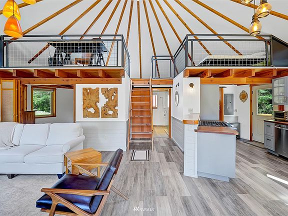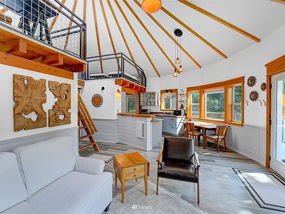Peaceful paradise!! Calming island retreat with partial Guemes channel views on 3+/- acres. Fully furnished - custom circular home with wraparound porch, handcrafted wood work throughout and luxury vinyl flooring. Stunning kitchen with steel countertops, walk in pantry & ss appliances. Cozy bedroom on main floor plus extra sleeping area and office space in loft. Beautiful bathroom with wood ceilings, tiled glass shower with beach rock & rain showerhead, walk in closet and w/d. Invite guests for the weekend where they will enjoy their own spacious private yurt with wood stove, kitchen and bath. Options galore-use as a main home, VRBO or expand and build additional home. Holiday Hideaway HOA includes beach & moorage access. A must see!