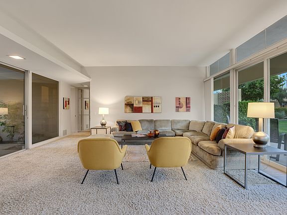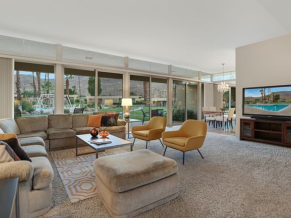 Beautifully maintained mid-century unit with exquisite mountain views! 3 bedroom, 3 bath unit at 2,096 square feet with large open floorplan combining living and dining areas with direct access to the poolside and private patios. Unit features fully updated kitchen, clerestory windows, exposed concrete block wall in the spacious bedroom areas, dual paned sliders in living room, updated bathrooms and showers and abundant closet space. Private patio has a covered area for more private entertaining while the poolside patio has breathtaking southern views of the greenbelt, pool and mountains! Located in one of the historically designated areas of Sandpiper and within walking distance of hiking, shopping and dining on El Paseo and so much more. Also includes 1 car detached garage space. Come and enjoy the good life!