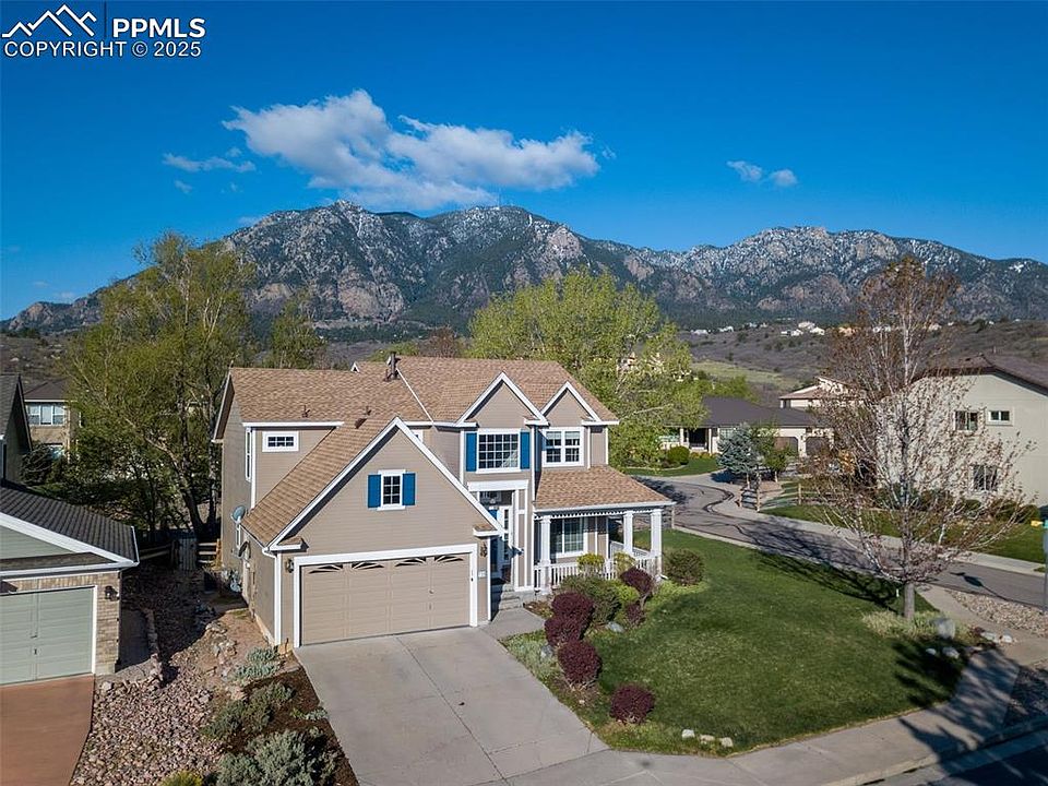 ***See the Amazing Video at the Virtual Tour Link on the listing*** This beautifully maintained home in the desirable Broadmoor Glen neighborhood within Cheyenne Mountain School District 12 is situated on a spacious corner lot. Step inside from the covered front porch and exterior entry to find hardwood floors throughout the main level. The entryway opens to a bright and inviting living room with a gas fireplace and wood mantle, perfect for cozy evenings. The heart of the home is the open-concept kitchen and family room, ideal for entertaining and everyday living. The kitchen features an island, ample cabinet space, and a walk-out to a stunning 20x16 composite deck, perfect for outdoor dining and enjoying the mountain views. The family room impresses with two-story ceilings, big windows, and a brick fireplace with wood mantle, creating a warm and dramatic focal point. Upstairs, the spacious primary suite offers a 5-piece bath with double vanity, a walk-in closet, and plenty of natural light. Vaulted ceilings enhance all upper-level bedrooms, and one features elegant French doors—perfect for a guest room, office, or studio. The upper level also overlooks the family room below, enhancing the home’s open and airy feel. The finished basement level completes the home with a spacious bonus room, ample storage, a full bathroom, and an additional bedroom. Step outside to a fully landscaped and fenced backyard with drip irrigation, a small patio off the deck, and breathtaking mountain views. Additional upgrades include new carpet installed in 2023 and a new furnace in 2020. This thoughtfully designed and meticulously cared-for home offers style, space, and spectacular surroundings—don't miss your chance to make it yours!