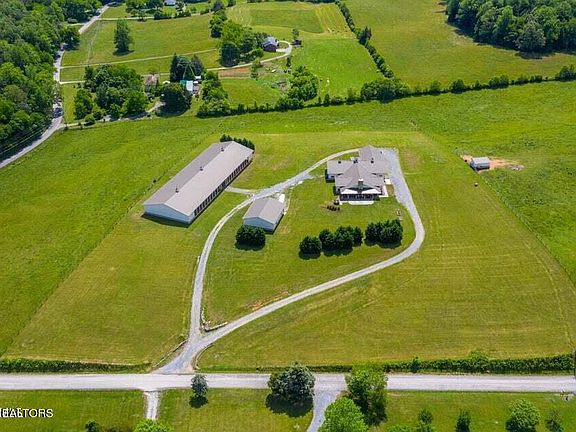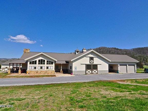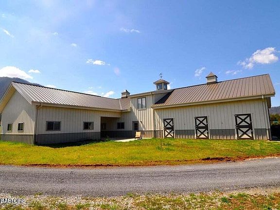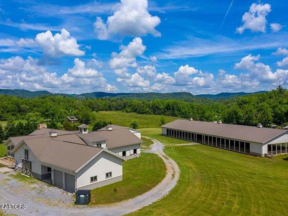 Live at the base of the mountain! 19.67 Acres surrounded by the Great Smoky Mountains, Equestrian's dream with open plan, 2/3 Bedrooms, 3 Baths, upper level apartment w/full kitchen, pine tongue and groove ceilings, quartz, granite, hardwood, 2 car main level garage, 7 stall barn can be entered from main level of the home, heated tack room, washing bay, Professional covered dressage arena (20 x 60 meters w/water), massive tractor shed, 24 ft run in shed, covered stamped concrete patios with fireplace. Such a lovely spot within 1 mile of riding trails in the Great Smoky Mountains!