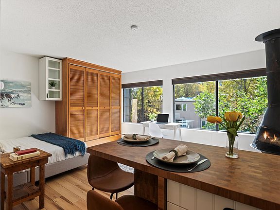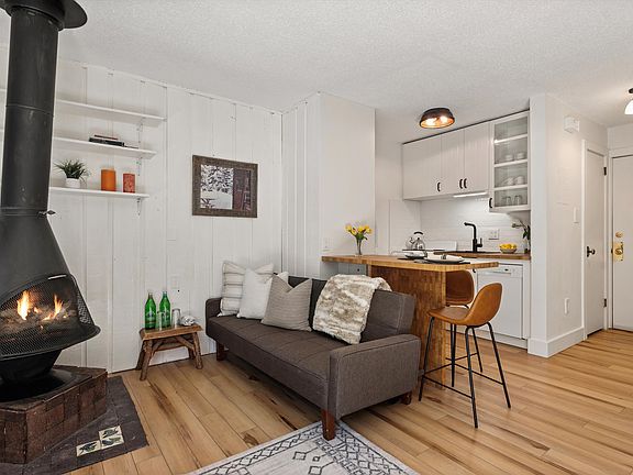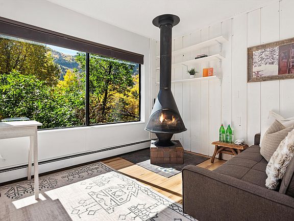 Great top floor studio in excellent Core location, walk to everything! Updated kitchen, bathroom and wood flooring. New upholstered headboard bed, mattress, linens/bedding, towels, area rug, art, bathroom accessories and kitchen supplies. Wardrobe closet, large walk-in closet, wood burning fireplace and Aspen Mountain views. One un-assigned off-street parking spot, storage closet and laundry room on lower level of building. One-year minimum. $4500 rent + utilities