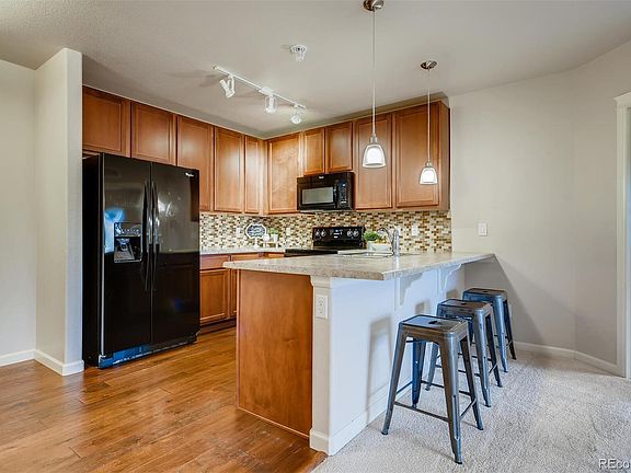 Spacious low maintenance two bedroom condo in the heart of Highlands Ranch at Town Center offers walkability to beautiful Civic Green Park, retail shops, restaurants and the local library. This bright and open floor plan features a gas fireplace to keep you warm during those cold winter evenings, abundant seating at the kitchen island, additional space for a dining table, in unit washer and dryer and two large bedrooms. The main bedroom has its own ensuite bathroom and large closet. Entertaining is easy with the double slider doors providing access to the outdoor patio with ample room for a grill and patio furniture. The back patio overlooks a nice little green space, and even has peek a boo mountain views! This well maintained main floor unit offers the convenience of no stairs to access your home. Enjoy all that the four Highlands Ranch Recreation Centers have to offer with your monthly HOA dues!