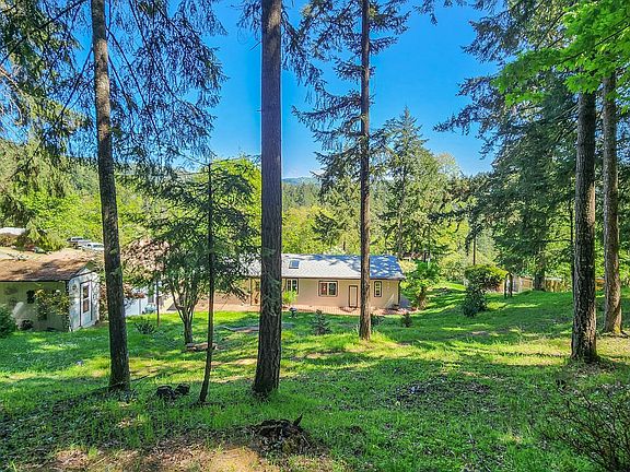 Not a drive-by! An agent must accompany potential buyers! This exceptionally clean and well-maintained 3 bedroom, 2 bath mfd. home with vaulted ceilings throughout is located in desirable Garden Valley with expansive decking front and back on 5.2 secluded and treed acres with lovely views of the mountains and tons of wildlife including deer, elk, bobcat, turkey and much more! The detached garage/carport has room to park 3 vehicles, a workshop in back with a walk-in cooler and has a metal roof. There is an additional metal carport for storage or parking more of your recreational vehicles. The home features expansive decking, front and back, a heat pump for heating /cooling plus a wood stove to keep you toasty warm in winter. The roof was replaced in 2020 and the windows have been upgraded to vinyl double pane. There is also a year 'round pond with numerous goldfish and a well for irrigation with holding tanks. Umpqua Basin Water serves the home for domestic use. The property also offers a deer fenced garden area, several fruit trees, a shed for wood storage, a potting shed, a tool shed and a large secure chicken coop. The home feels quite roomy inside and could be just what you are looking for! This property has everything you need and much more! Make an appointment today to view this beautiful and appealing property at an affordable price before it's gone!
