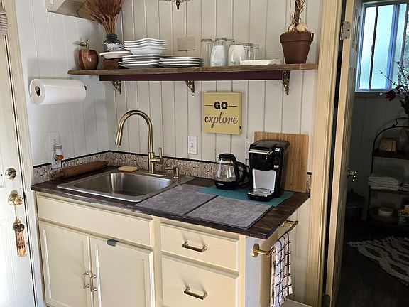 This cottage has a kitchen with a apartment size fridge, and a stove that uses propane. The stove has a cooktop and oven. The kitchen has coffee maker, hot water kettle, toaster, dishes, and full set of pots and pans. If you want to eat inside, there are wooden TV trays. Outside is a lovely table with 2 chairs. There is a mini split AC/Heater which has a remote. Large TV, internet and small desk space.