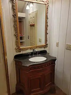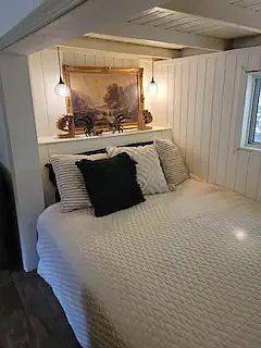 There is a queen size bed set in an alcove that is so cozy! There is a large TV in the living area, and a separate bathroom with a shower and closet. This cottage is quaint and super cute.
