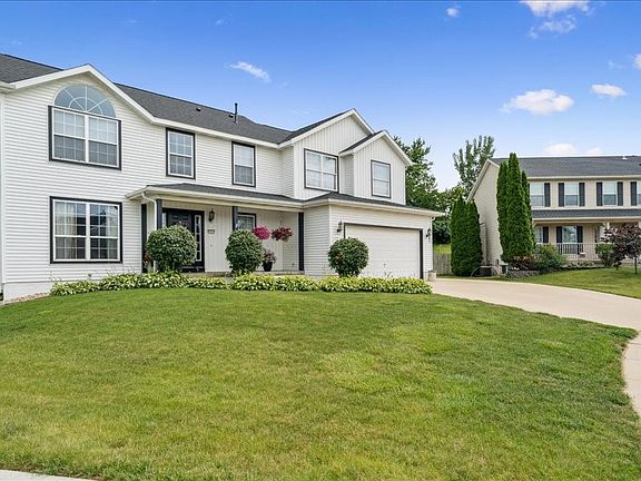 Stately & Spacious with Modern Updates! This gorgeous two-story home offers over 3,000 finished square feet of thoughtfully updated living space on a generous 0.58-acre lot. Enjoy peace of mind with major upgrades including a new roof (2022), exterior vinyl siding (2021), and brand-new furnace and A/C (2024). The water heater was replaced in 2018, and newer carpet and fresh paint enhance the above-grade levels. The great room is complete with vaulted ceilings, a wall of windows to your private back yard, and a gas fireplace. The kitchen features rich cherry cabinetry, a center island and pantry, a new range (2022), and a refrigerator (2020). With four bedrooms and 2.5 bathrooms, there’s room for everyone. The primary en suite is spacious with vaulted ceilings, walk in closet and oversized private bathroom complete with a soaking tub and separated shower. Step outside to a private, tree-lined backyard with a large deck that leads to an expansive patio—complete with a basketball court! A storage shed adds convenience, and the outdoor space is perfect for relaxing or entertaining. An additional parking pad has been poured, and there is plenty of room to add a third stall garage is the new owners would like. Also, there is a spacious walk in mud room on the main level, that includes washer and dryer hook ups if you would like the laundry on the main level. The lower level is plumbed for an additional bathroom if wanted