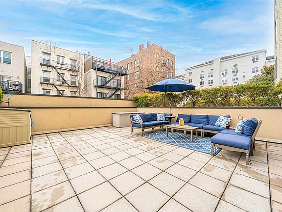 Immaculately renovated 2 bed 2 bath duplex with huge terrace and covered indoor parking for multiple cars. Open chef's kitchen features stainless steel appliances, granite countertops, custom cabinets and backsplash. Oversized great room is flooded in light through a wall of 6 floor-to-ceiling windows. Entertain effortlessly indoors and out via twin sliding glass doors serving your private oasis, a 600sf outdoor space. Both bedrooms are upstairs and enjoy ample closet space and beautifully appointed baths featuring custom marble and quartz tilework, Kohler fixtures and frameless glass shower enclosures. Home also boasts hardwood floors, recessed lighting, CAC, surround sound speakers, laundry in unit, and fantastic storage including a 'smart hub' for all your technology beneath the stairs. All this plus an abundance of deeded, indoor parking and extra storage in an elevator building with gym. Close to the city's best shopping, dining, parks and recreation with easy access to NYC via Path, Ferry or Bus.