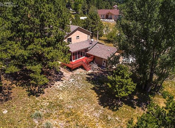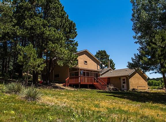Stucco custom 2-story on 1.24 park like, private acres in desirable Woodmoor!! Two separate lots are included with purchase!! Freshly painted interior with new wood floors. Beautiful kitchen with slab granite counters, island, recessed lighting, cherry cabinetry and stainless steel appliances. Spacious great room with vaulted ceilings, wood beam accents, gas log fireplace w/ travertine tile surround and skylights. Recently remodeled half bath on main level. New interior doors and trim on main level. Large dining room with wood floors that walks-out to the sunroom and back deck. Sunken living room with vaulted ceilings, multiple windows for lots of light and a wood burning stove with brick surround. The upper level full bath was recently remodeled and features a deep soaking tub. Master suite with walk-in closet and private bath. The home has a low maintenance stucco exterior and vinyl windows. The deck is freshly stained and has great mountain views. Award winning School District 38! Close to the amenities of Monument and Palmer Lake with great access to Colorado Springs, Denver, I-25 and Highway 83!