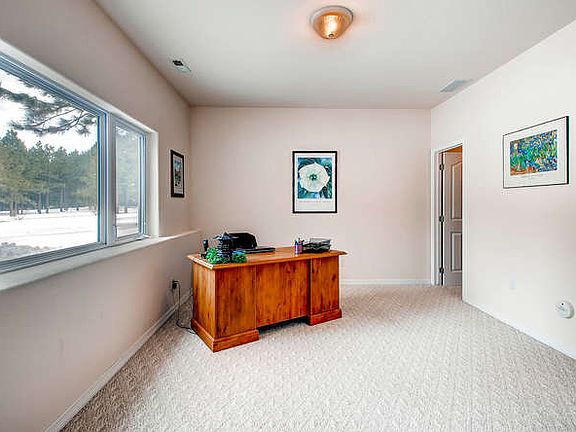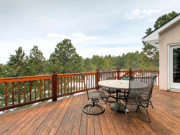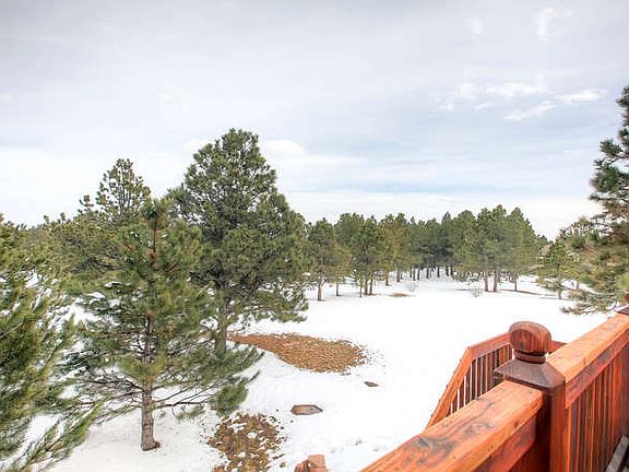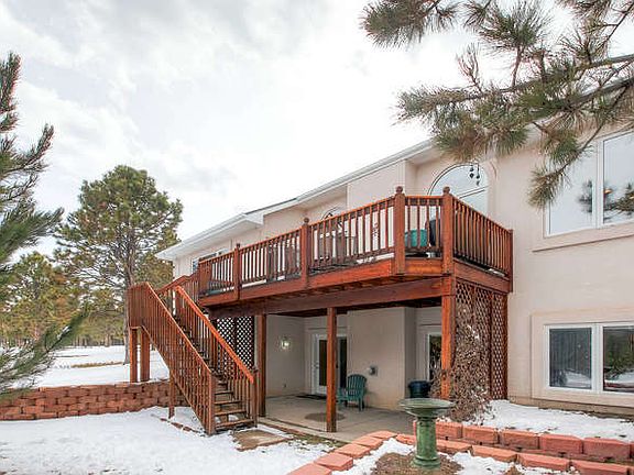 Absolute Perfection! This easy-care stucco walkout rancher is located on 2.5 park-like peaceful acres. Looking for serenity in the pines? This is it! The welcoming open floor plan is bathed in natural light. Main level includes elegant Owners Retreat with luxurious 5-pc bath, study with built-in bookshelves, and spacious formal dining room perfect for large gatherings or intimate dinners. The grand Great Room with airy vaulted ceilings and heart-warming stone fireplace opens to a kitchen the family cook will adore! The finished basement has one en-suite bedroom plus 2 more large bedrooms and bath, an enormous storage room and a game room with cozy fireplace that walks out to a covered patio. This gracious home includes so many architecturally interesting features such as barrel ceilings, arched windows, wainscoting and coffered ceilings. You'll enjoy serene summer evenings on the huge deck surrounded by Mother Nature's bounty. And let's not forget the 800 s.f. 3 car garage with tons of storage and vehicle room. This home is perfectly located at the end of a cul-de-sac - far from the noises of traffic and congestion but within an easy reach of shopping, Kings Deer Golf Course, schools and an easy commute to either Denver or Colorado Springs. Come breathe the fresh country air - spring is in the air!