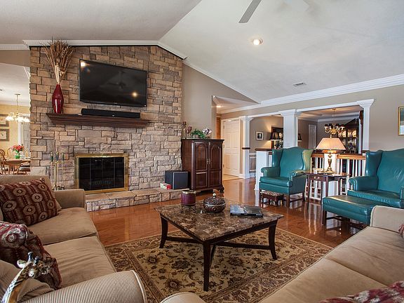 Ideal lake front living. Brick walkout basement rancher 4 BR/4BA/2HBA, remodeled 2002 on Cul-De-Sac. Huge screened porch with tile floor overlooking unobstructed lake view. Front entry with Pella front door and cascading water pond. Kitchen with gas Jenn-Air range, double ovens, warming drawer, double sinks, and corian counter tops. Eat-in kitchen area. Great room with vaulted ceiling and wood burning fireplace. Two master suites. Master bath with heated floor, over sized shower. Lower level rec room with fireplace, wet bar, and surround sound. Central vacuum, security system. Lake fed irrigation. All windows and doors low-e. 3 HVACs. 2 car garage on main, 1-car lower level. Dock has electricity, motion detector lighting, wireless boat remote. Drop ladders and 2 storage areas.
