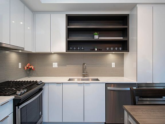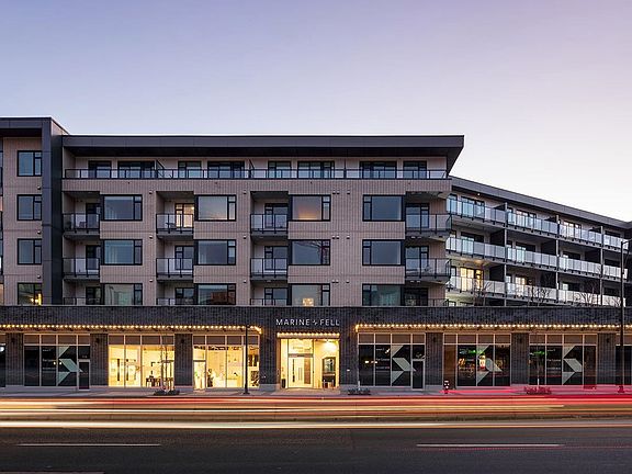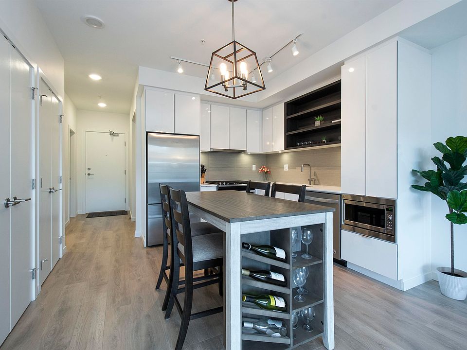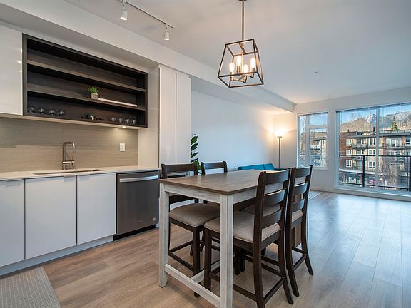 Welcome to Marine + Fell by Anthem Properties. Built in 2019, this LIGHTLY LIVED IN (847ft) 2bed/ 2 bath + den unit offers an open floorplan, over height ceilings, and MOUNTAIN VIEWS. Finishes include: Laminate flooring and radiant heat throughout, stainless steel appliance package incl. gas range, (Fisher/Paykel) Fridge, and quartz countertops. Unit has large 138ft private deck (23x6) as well as access to buildings common outdoor patio and 1,000 SF entertainment lounge with kitchenette. Fantastic location, close to transportation, Schools, shops, and the spirit trail. One parking stall, a large storage locker + car wash area and communal bike room, you're not going to want to miss this unit! Pets & rentals (no short term) are allowed. Balance of 2-5-10 Warranty!