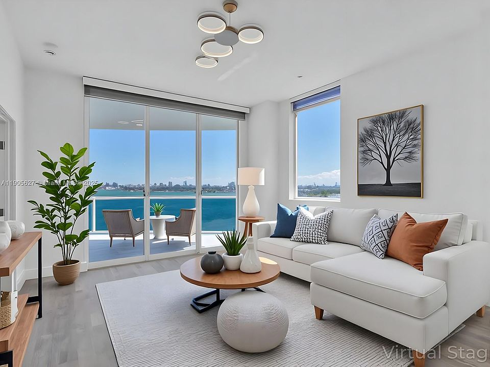 This waterfront unit is a beautifully updated 2-bedroom plus 1 den, 2-bath corner unit. Flooded with sunlight from, this home offers a bright, open layout with high ceilings and a sleek design. The property has been recently renovated, featuring quartz countertops and stainless steel appliances. Both bathrooms have been stylishly redesigned with contemporary finishes. Enjoy 3 private balconies showcasing panoramic views of the bay and Miami's skyline. Residents enjoy resort-style amenities, 2 parking spots, including a waterfront pool, fitness center, and social lounge. Perfectly located in a quiet boutique building near top restaurants, shops, and the beach this is Miami living at its best.