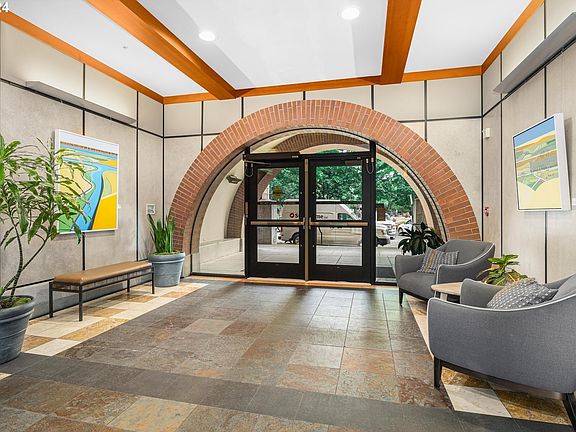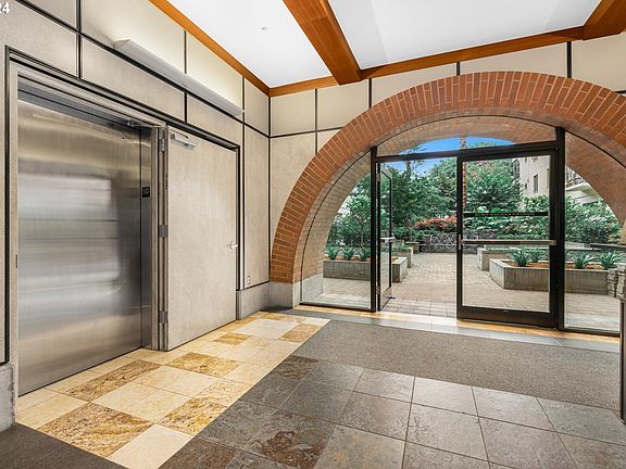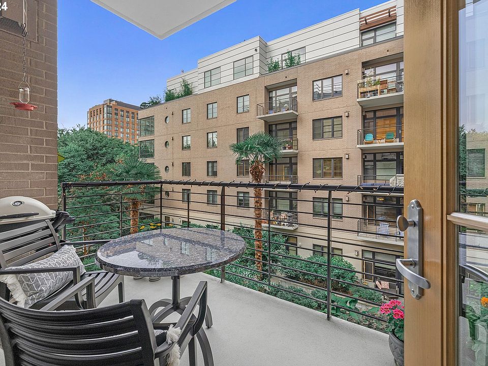 Discover urban living at its finest in this exquisitely renovated condo at Tanner Place, nestled in the heart of Portland's vibrant Pearl District. This serene courtyard unit offers a perfect blend of tranquility and convenience, with every inch thoughtfully updated over the past year using the finest materials. As you enter, you're welcomed by high ceilings and stunning exotic Brazilian teak hardwood floors that flow throughout the living space. The living room is bathed in natural light, courtesy of a beautiful wall of windows with views of the lush courtyard. For the ideal amount of light or privacy, simply adjust the Hunter Douglas motorized blinds at the touch of a button. Step onto the covered balcony to enjoy the peaceful garden atmosphere—an oasis of calm in the heart of the city. The kitchen is a chef's dream, featuring brand-new stainless-steel appliances, and generous bar seating. New natural maple cabinet door and drawer fronts, complemented by modern tile in the kitchen and bath, as an industrial touch. Organizing is effortless with custom California Closets in the coat closet, laundry, and spacious walk-in closet in the primary bedroom. The smart LG stackable compact washer and dryer are included for added convenience. In addition, a brand-new high-efficiency AC unit set to be installed in Sept-Oct, ensuring comfort year-round. This condo also comes with deeded parking and storage, plus electric vehicle charging capabilities in the garage. Located next to Jamison Square park and conveniently located on the Streetcar lines, this property offers unparalleled access to shopping, dining, and entertainment for exceptional living.