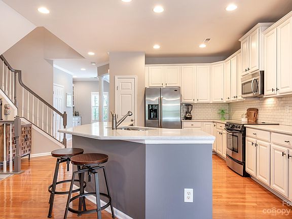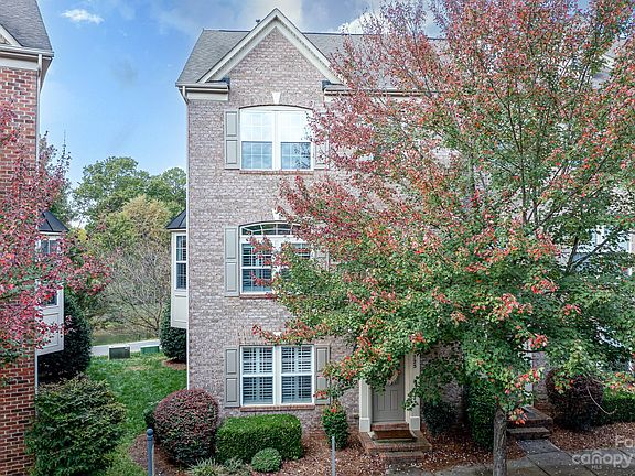 Perfectly located to enjoy all Davidson has to offer! Less than a mile to the town center for excellent dining options, quaint movie theater, boutique shopping, community events & Davidson College happenings. Also a short drive to I77 for an easy commute. Well appointed, end unit home w/extra windows/light, open floorplan, plantation shutters & hardwood floors on the common area level. Updated kitchen w/tile backsplash & quartz counters, pantry, black hardware & large breakfast bar/island. Formal dining room (currently used as office) features a built-in butler's pantry. Primary bedroom w/tray ceiling, big walk-in closet & updated bath w/tiled step-in shower, free-standing soaking tub & dual vanity sink w/framed mirrors & quartz counter. Big secondary bedroom also w/walk-in closet & updated bath w/modern lighting, black hardware, quartz counter & tiled tub/shower. Flex space on first floor w/half bath. Rear loading, two-car attached garage w/Tesla charger. Deck/balcony w/treed view.