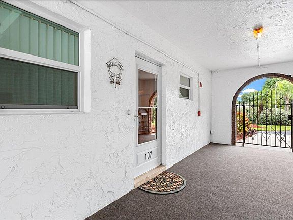 Fairway Condominiums has successfully passed the mandated Florida inspection with no issues detected and won't require another inspection for 10 years. The entire building is constructed with block and concrete. Unit 107 offers enhanced safety features, including drop-down hurricane shutters on the patio and all bedroom windows. All windows and sliding glass doors are hurricane-resistant, with a lifetime warranty that transfers to the new owner. This fully renovated, ground-floor, corner unit spans 1,184 square feet and includes 2 bedrooms and 2 bathrooms. Key features include private parking directly behind the back entrance, a mailbox conveniently located outside the front door, and the community pool just steps away. The low HOA fee covers water and internet. Additionally, the price has been improved!