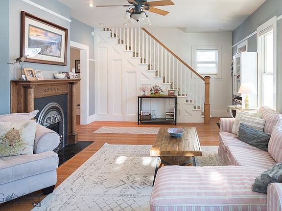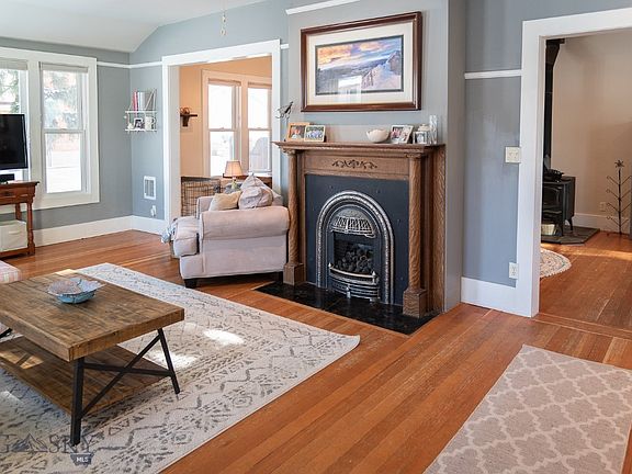 725 S Pacific Street, located just two blocks from UMW, on a tree-lined street in Dillon, Montana. This 1910-built home features a charming two-story home, a studio space a single-car garage with room to store your gear. a cheery exterior and brick planters welcome. The living area with fir floors, large windows and natural light. The crown jewel of this space is a pewter front gas insert fireplace. The dining area is perfect for hosting large gatherings. A nook with built-ins, exposed brick, and a wood-burning stove. A kitchen featuring stainless steel appliances, granite countertops, shaker-style cabinets, island, pantry for storage. A fireplace in the eat-in kitchen. Laundry with storage and a full bath with subway tile finish the main level. Upstairs are three bed and two bath, offering plenty of space. The primary suite has, two closets, and stove. The en-suite has dbl sinks, a marbled top, and tiled walk-in shower. The backyard is stunning with, fruit trees, and garden areas.