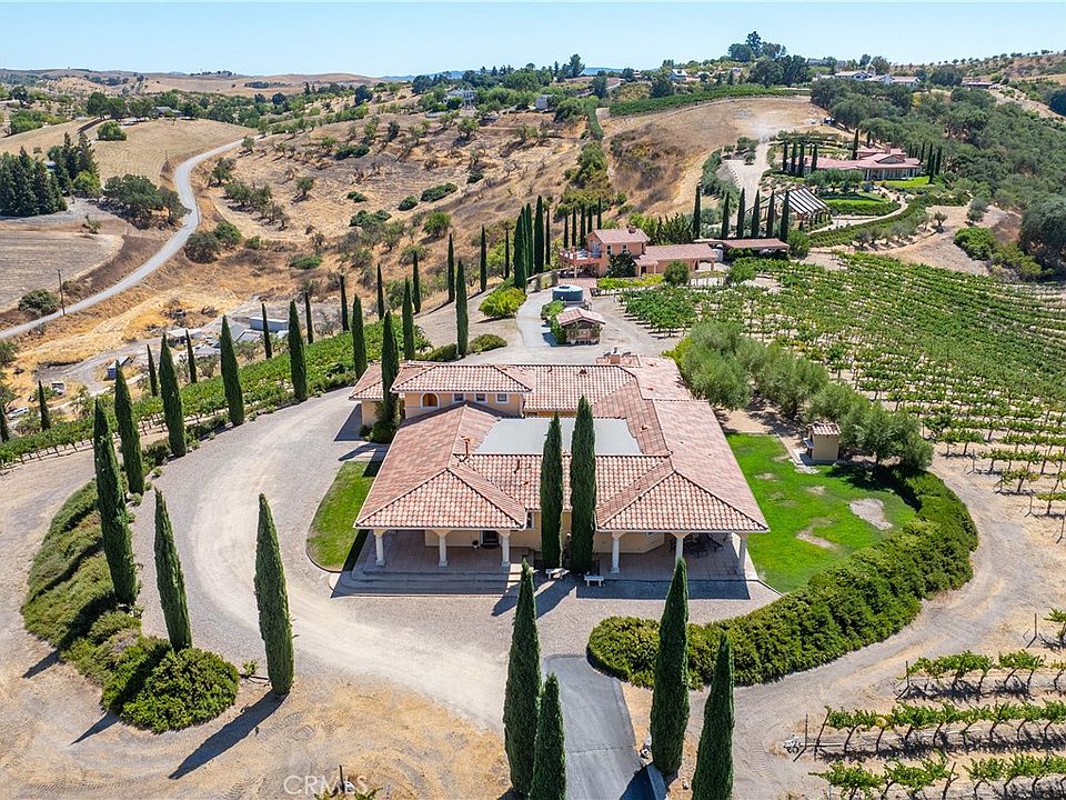 A captivating wine country estate with income-producing opportunities in Templeton. Set on 38± acres with 25± acres of premium Cabernet Sauvignon and Merlot under contract to Daou, this property offers multiple revenue streams through short-term rentals, private events, and viticulture. Two custom homes span approximately 5,000 sq. ft. The luxurious Tuscan-inspired main residence features 4 bedrooms and 4 bathrooms, while the second home, built in 2000, offers 2 bedrooms and 1.5 bathrooms. Ideal for guests, caretakers, or vacation rental use. Both homes are on a single parcel, with a second parcel included in the sale. Gated and private, the grounds feature sophisticated design details, hand-painted murals, and remarkable vineyard views. Multiple patios and fountains provide a tranquil setting for elevated indoor-outdoor living. Previously operated as an in-demand wedding venue and short-term rental, this is an extraordinary chance to experience the best of wine country living while building long-term value in Templeton.