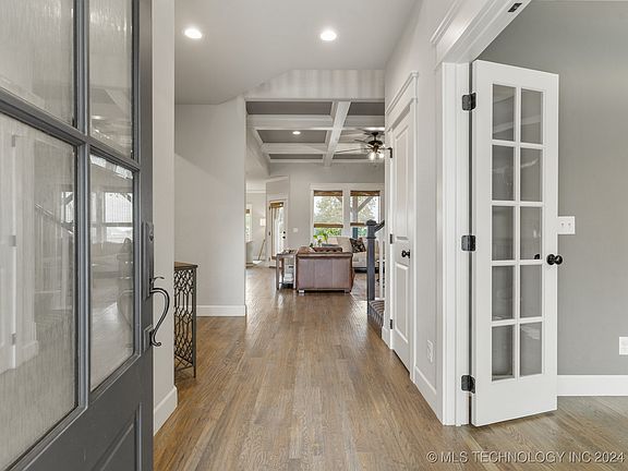 Beautiful home in Gated Haddington Heights located in Jenks West School district. Home features an inviting front porch that opens to the two story entry with Study overlooking beautifully landscaped front yard. Great room has floor to ceiling stone fireplace with built-ins, box beam ceiling & a wall of windows bringing in the natural light. Stunning quartz kitchen with ss double ovens, chef’s gas cooktop, built in professional series refrigerator & walk-in pantry. Dining area & large island with undermount sink. Extensive hardwoods on main level & upstairs hallway. Primary suite has hardwoods, tray ceiling, new spa bath with soaking tub, double sink, walk in shower & closet with built-ins. Additional suite down with private bath & walk-in closet. Powder bath & Mud room. 2 bedrooms up with pullman bath & with walk–in closets. Game room/Media Room has screen, projector & equipment. Covered patio with new expanded deck. Garage with epoxy floors, tankless hot water & sprinkler system. Enjoy nearby downtown Jenks Ten District, New Outlet mall & Access to River Trails from the neighborhood.