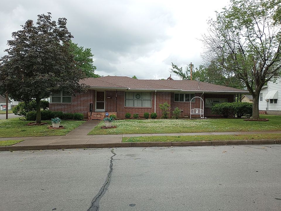Beautiful brick house on corner double lot, custom stain glass off dining room doors, lots of kitchen cabinets, extra large laundry room, oversized 2 car garage with extra storage cabinets, shed with extra storage space, nice size tornado shelter.