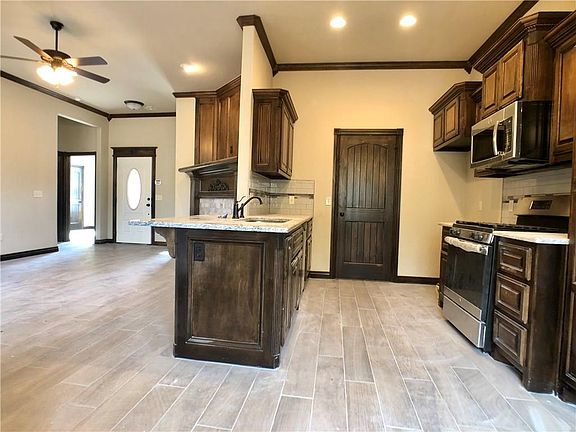 Completed and ready for its first owner. Custom build cabinets throughout the home and installed, open floor plan with wood look tile spread through the open/split floor plan and all wet areas of the home. Front bedroom has valeted ceilings and 2 closets. Don't miss out on this brand new build in Moore under $160k