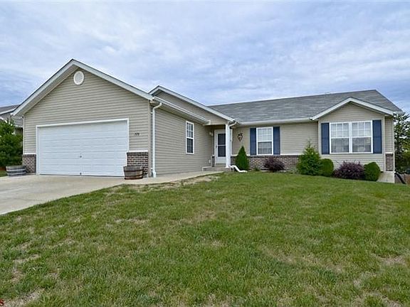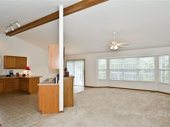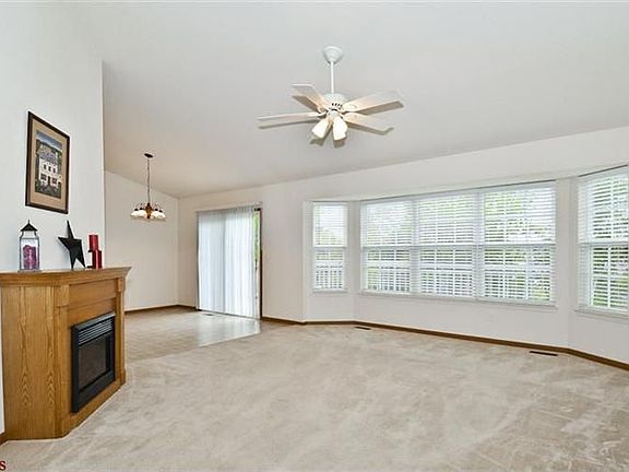 Very Open floor plan in this 3 bedroom, 2 bath ranch home with walkout lower level. 4th Bedroom in lower level. Vinyl siding with partial brick exterior, covered porch and large deck off Breakfast Rm. Big, open kitchen with Pantry, built-in microwave, electric stove, and side by side refrigerator included. Vaulted in kitchen, breakfast room and greatroom with 5 bay window and white blinds Cozy, electric fireplace. spindled staircase to walk out lower level. Large, main floor laundry with double closet. 2 car garage with opener. Lots of oak cabinets with breakfast bar. Spacious master bedroom with roomy, private bath w/ linen closet and walk-in closet. 2nd full bath with double linen closet. Fenced yard, with large wood deck and walk-out to patio. Located close to public schools and only 4 years old. Basement has rough-in, sump pit and pump. 2 Car Garage with Opener. Home in good condition - needs some paint and possibly some carpet replacement.