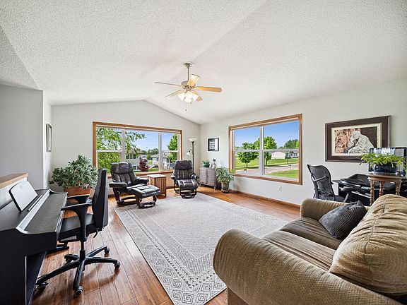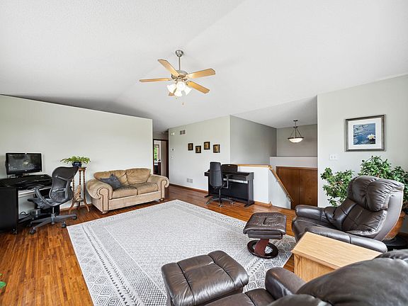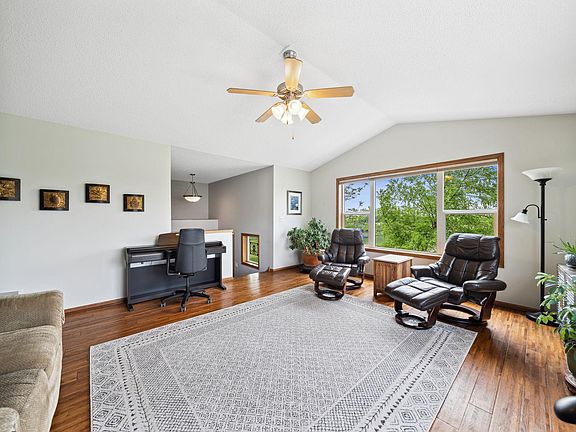 This stunning property boasts gorgeous sunset views from the front and a large deck out back, perfect for entertaining guests. The hardwood floors and newly finished basement (with an electric fireplace and in-floor heat) provide luxurious comfort. With two large family rooms, there's plenty of space to relax and unwind. Located near the Zumbro River, Downtown Kenyon, and the Kenyon Country Club, this home offers both serene natural beauty and convenient access to local amenities. The weed-free grass throughout the property has been meticulously maintained, and the huge windows let in ample natural light, adding to the home's curb appeal. Come see this gem today!