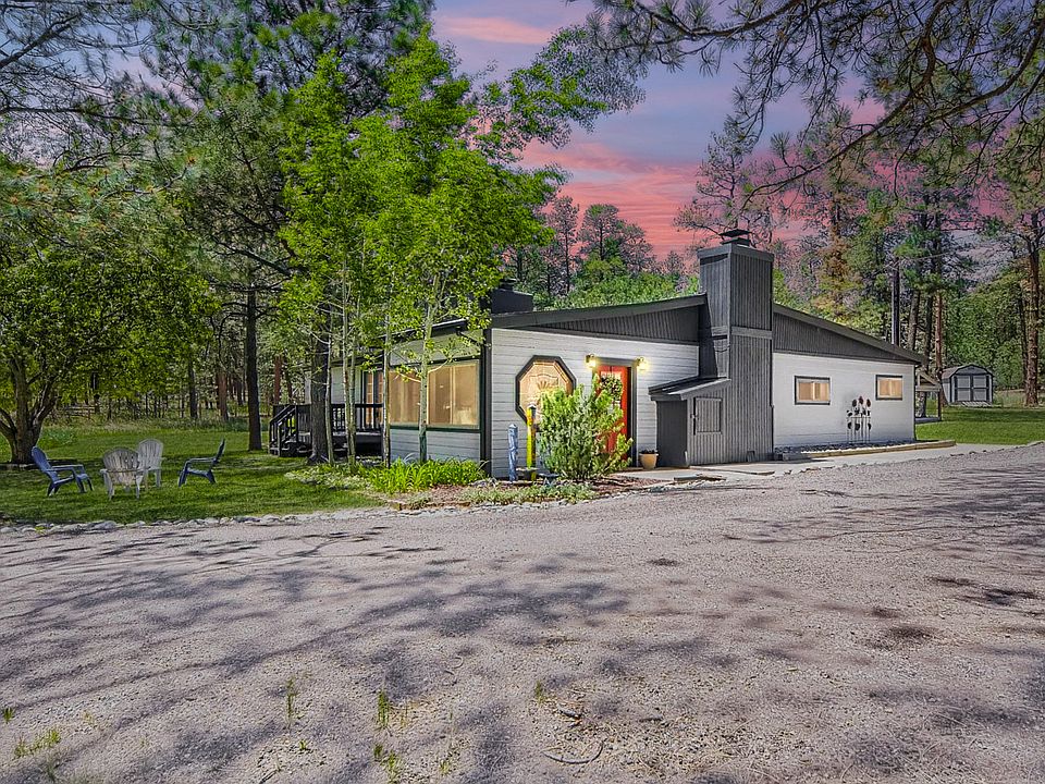 This quaint Black Forest gem is nestled perfectly between the Ponderosa Pines. Spacious, light, and bright floorplan boasts a study, fireplace, cozy sun room, lvp floors, new pinnacle windows, and fresh interior and exterior paint. The primary bedroom is its own retreat with an additional wood-burning fireplace and a small private deck with beautiful french doors. The concrete patio off the back of the property is a quiet place to enjoy a morning cup of coffee or an afternoon cocktail. The fenced area is perfect for dogs and the oversized detached 2-car garage and shed provide tons of extra storage. 2 acres of lush, flat meadow land gives you plenty of room to spread out and enjoy the outdoors. Located in highly sought-after, award-winning School District 20. close to the many amenities of Powers, Woodmen, and Northgate. New Roof 2021. No hoa or covenants, plenty of options to make it your own. Adjacent .89 acres is also for sale.